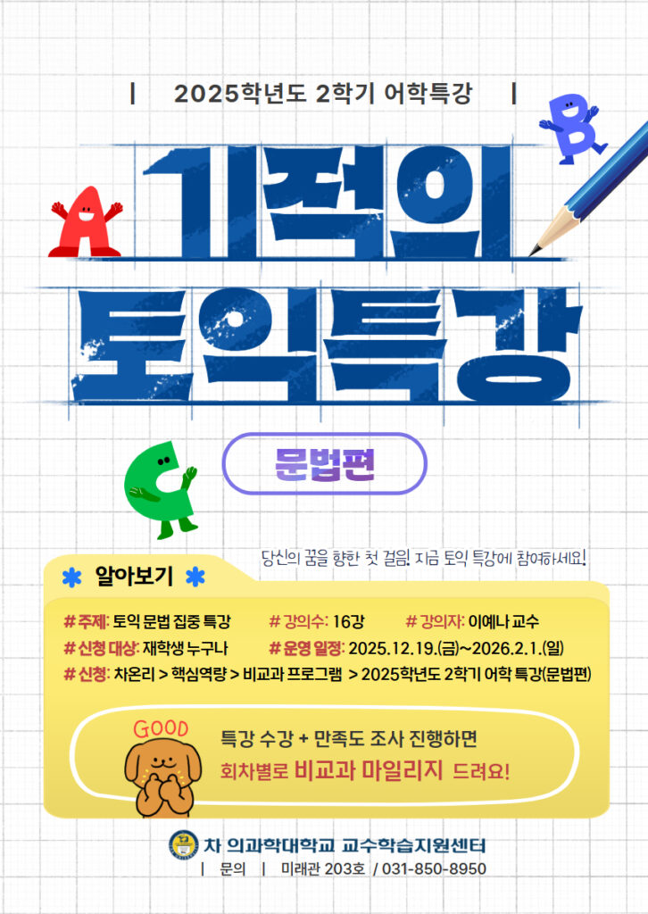 이 외에 질문이나 문의사항은 교수학습지원센터(031-850-8950)로 문의하면 된다. 이번 겨울방학 동안 토익 문법 강의를 통해 자기 계발과 토익 점수 향상을 동시에 이룰 수 있는 시간이 되길 바라며, 차 의과학대학교 학생들이 자신의 꿈을 향해 한 걸음 더 나아가는 계기가 되길 기대한다.