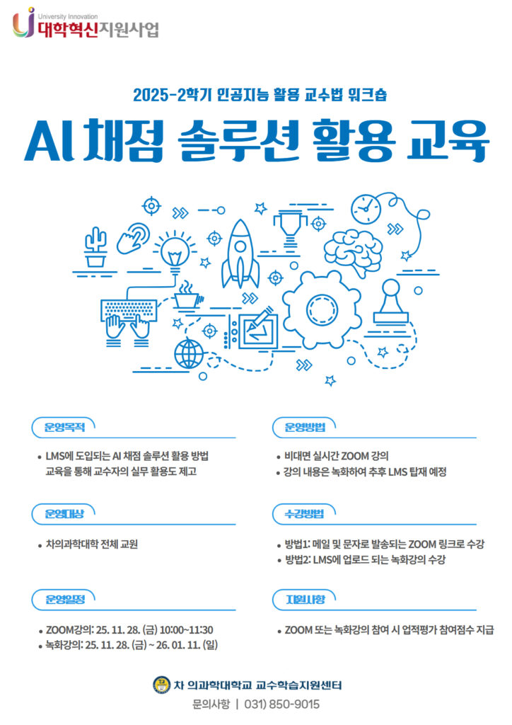 차 의과학대학교 교수학습지원센터는 LMS에 새롭게 도입된 AI 자동 채점 솔루션의 활용도를 높이기 위해 전 교원을 대상으로 실무 중심의 교육을 진행한다. 이번 교육은 교원들이 새로운 채점 시스템을 실제 강의 운영에 효과적으로 적용할 수 있도록 돕기 위해 마련되었으며, 솔루션 운영사의 전문 교육 담당자가 강의를 맡는다.