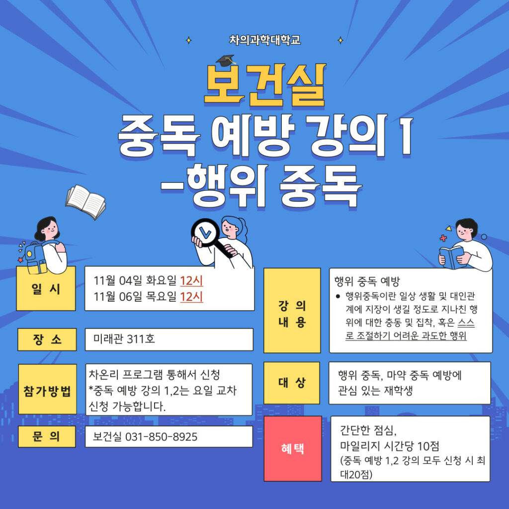 본 프로그램은 2025년 11월 4일 화요일과 11월 6일 목요일 12시에 미래관 311호에서 진행한다. 화요일은 행위 중독에 대해, 목요일은 마약 중독을 주제로 강의가 열린다. 두 날짜 모두 신청가능하며, 차온리(chaonly.cha.ac.kr)에서 11월 3일 16시까지 신청 가능하다. 간단한 점심과 시간당 마일리지 10점을 받을 수 있으니 행위 중독과 마약 중독 예방에 관심 있다면 신청하면 된다.