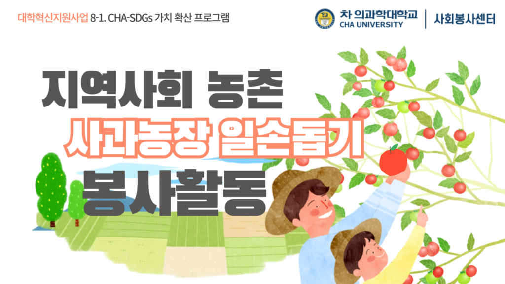 차 의과학대학교 사회봉사센터에서 2025학년도 2학기 지역사회 농촌봉사활동 프로그램을 진행한다. 이번 봉사활동은 포천 관내 황금사과농원에서 사과 열매 따기 등 지역사회 일손 돕기 위주의 봉사활동이 진행된다.