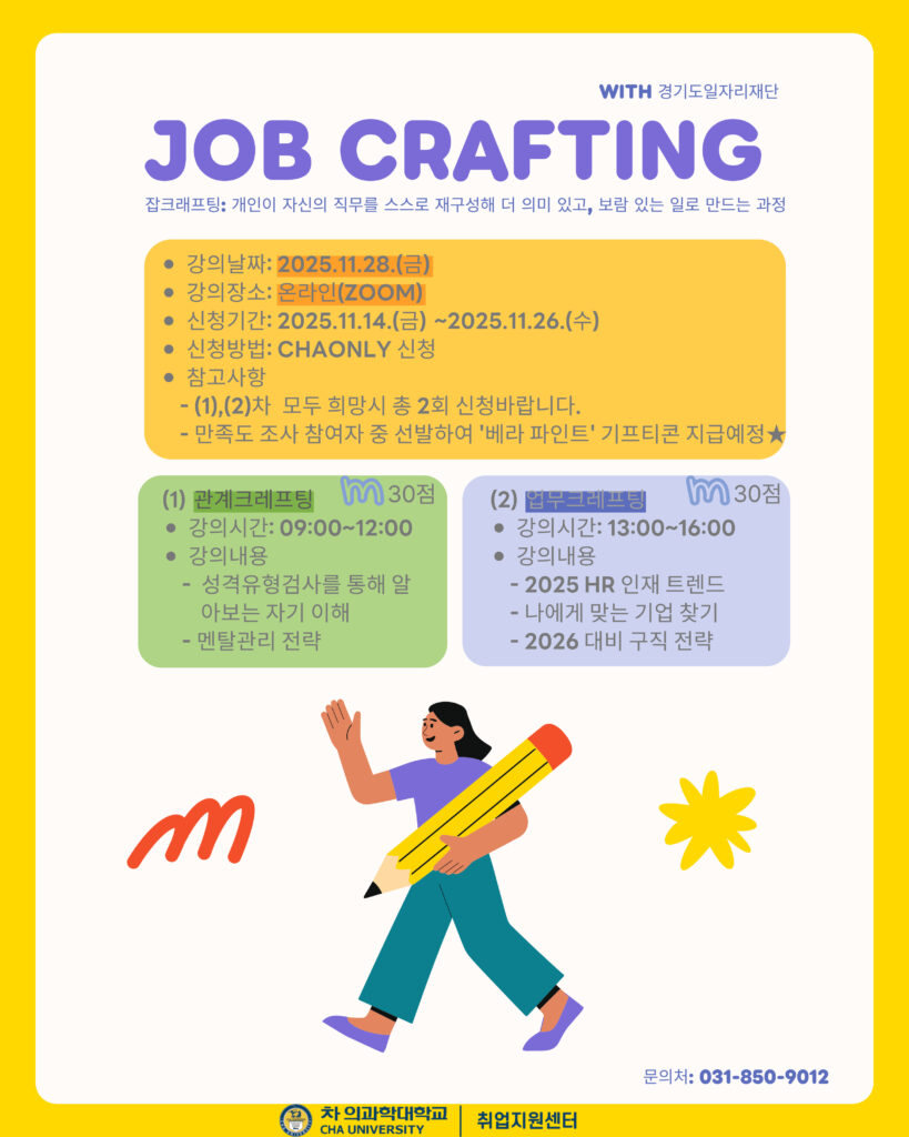 차 의과학대학교 취업지원센터에서 다가오는 11월 28일에 잡크래프팅이 진행된다. 잡크래프팅은 개인이 자신의 직무를 스스로 재구성하여 자신의 일의 의미와 만족도를 높이는 과정이다. 학생들은 이 시간을 통해 자신에게 적합한 업무를 탐색하는 데에 도움을 받을 수 있다.