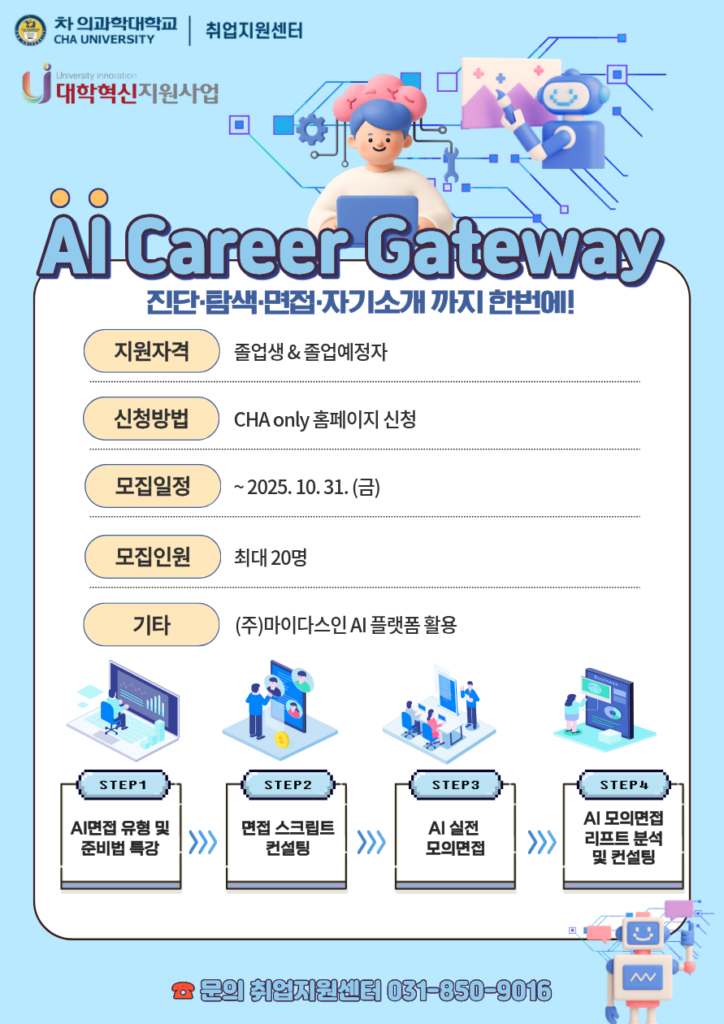 차 의과학대학교 취업지원센터에서 AI 기반 취업설계 및 면접역량 강화 프로그램을 진행한다. 해당 프로그램은 AI 기반 진단을 통해 개개인에게 맞는 맞춤형 진로 설계와 취업 전략 수립을 지원해 준다.